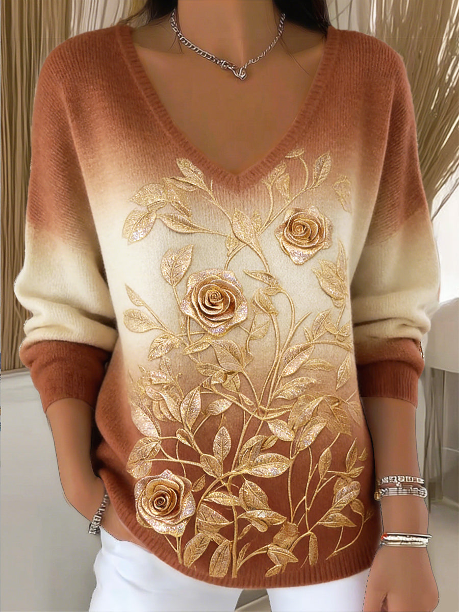 Dámské 3d gradient blikající květinová tisk neformální v krku svetr