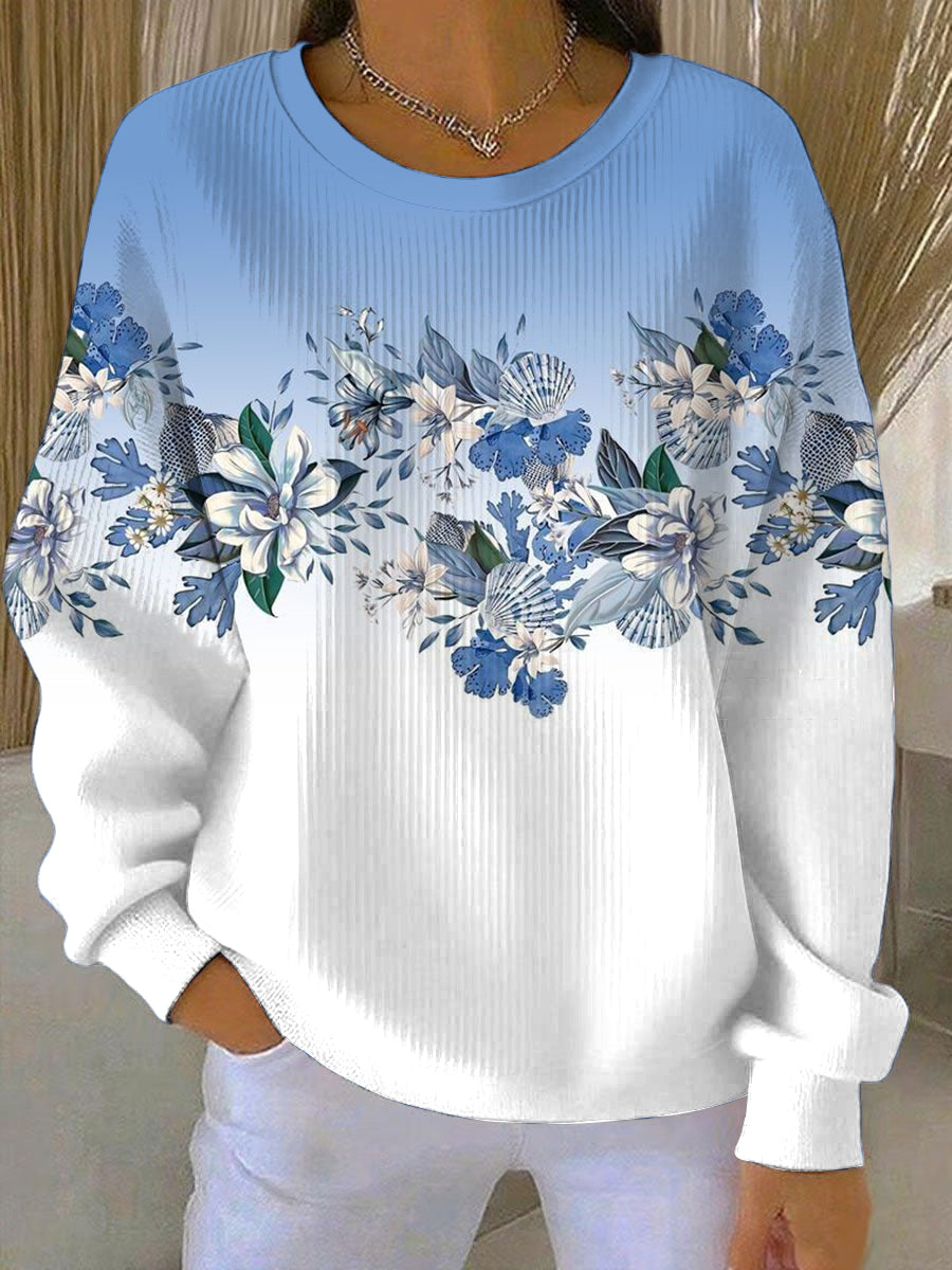 Dámské čerstvá modrobílá gradientní mikina s květinovou a škrupinovou tištěnou