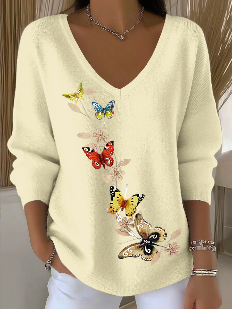 Dámské čerstvé béžové vneck svetr s barevným motýlem a květinami