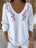Dámské čerstvé světle modré vneck svetr s růžovou a modrou květinou a motýlem výšivky na vneck