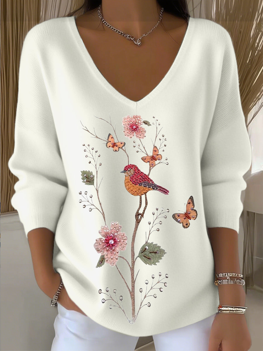 Dámské delikátní bílý vneck svetr s ptákem květinou a motýlem potahovaný vzor