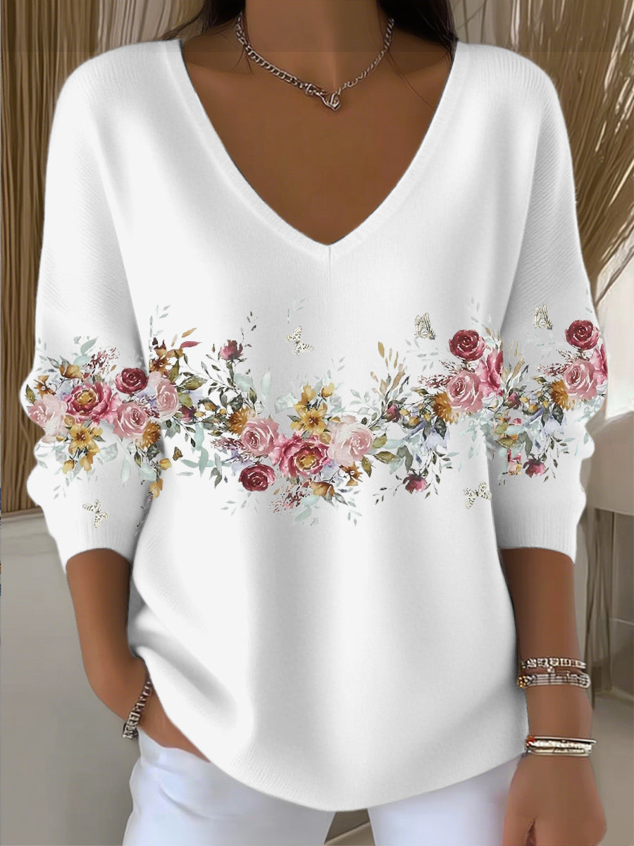 Dámské elegantní bílý vneck svetr s květinou a motýlem vzor