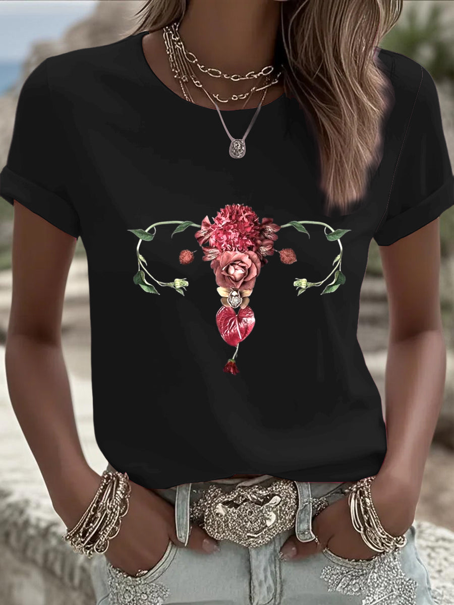 Dámské elegantní černé ttričko s bohatou červenou květinovou mateřskou tištěnou