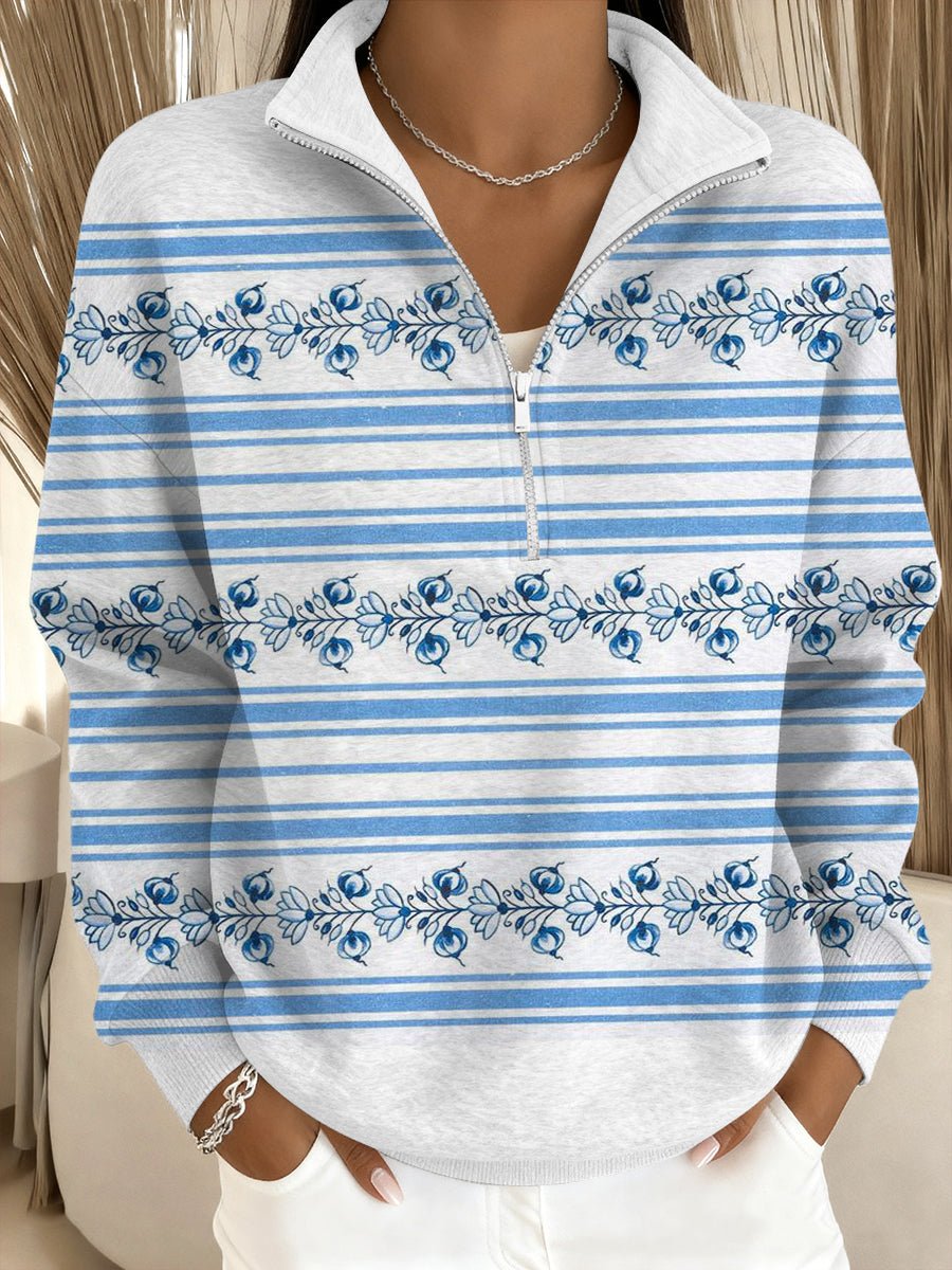 Dámské elegantní modré květinové pruhy stojangolier mikina