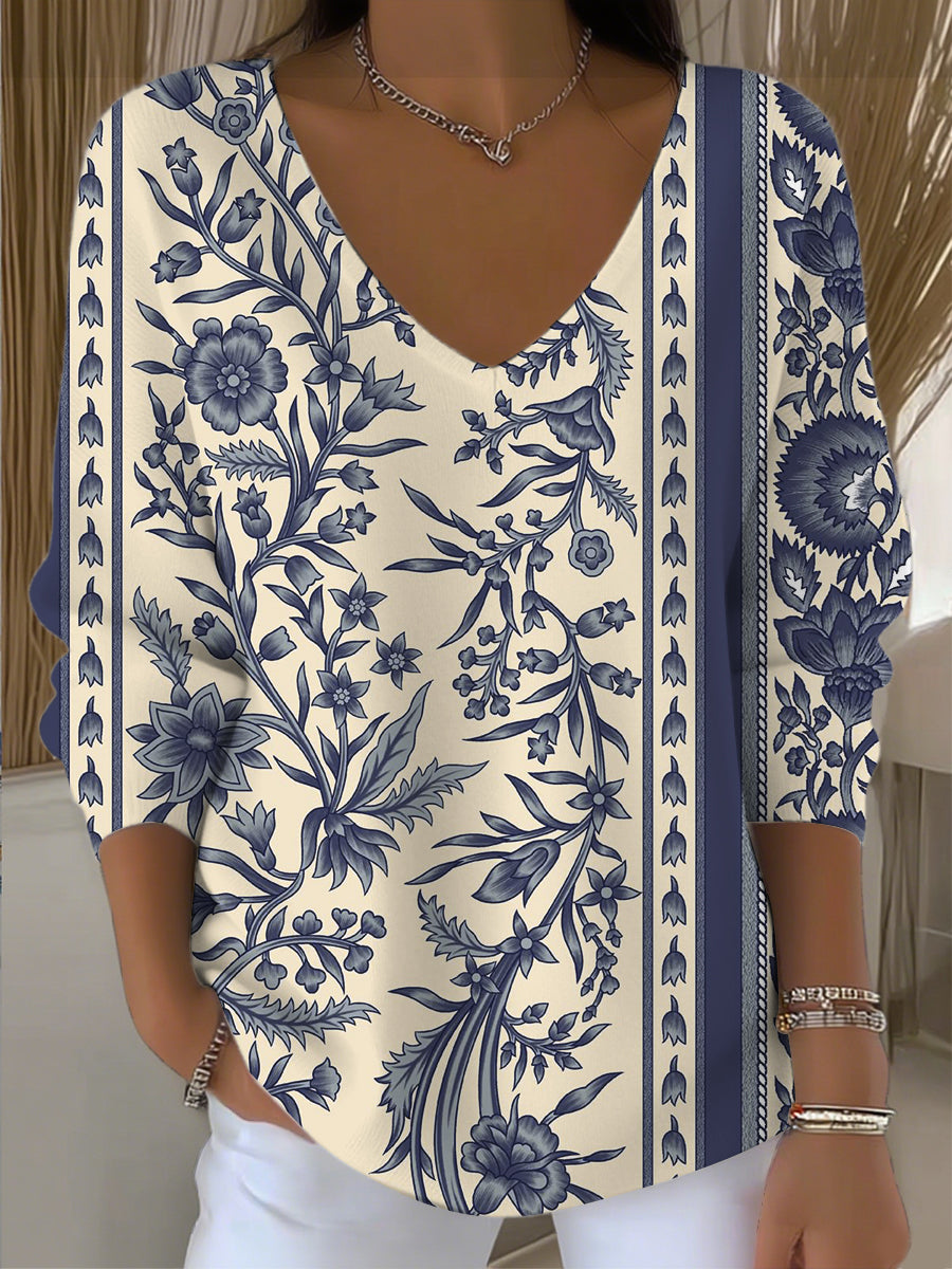 Dámské elegantní modré květinové tisk béžové vkrk top