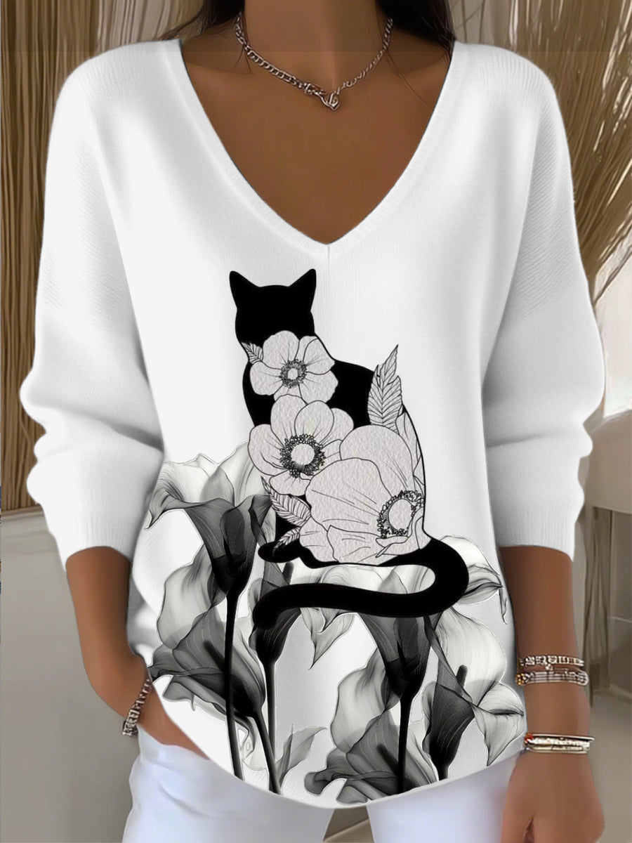 Dámské evropské styl bílý v-neck svetr s jednoduchou kočku a květinovou výšivkou módní a pohodlné vhodné pro každodenní nošení