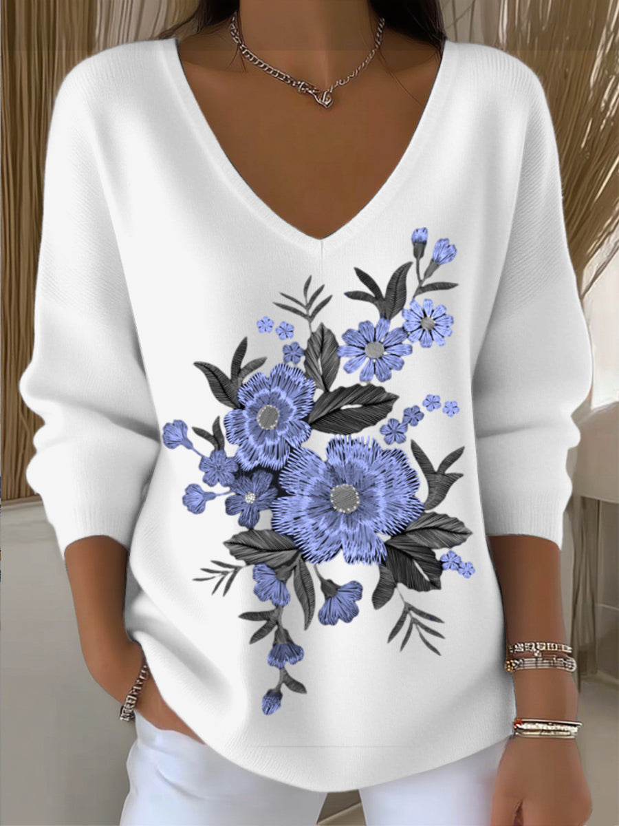 Dámské evropské styl bílý v-neck svetr spárovaný s okouzlující květinovou výšivkou módní a pohodlné splňující denní potřeby nošení