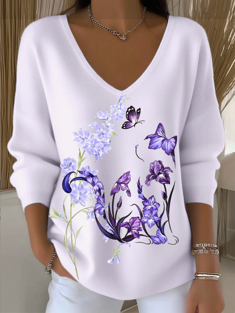 Dámské evropské styl světlé fialové v-neck svetr zdobený nádhernou kočku a květinovou výšivkou módní a atmosférické vhodné pro každodenní nošení
