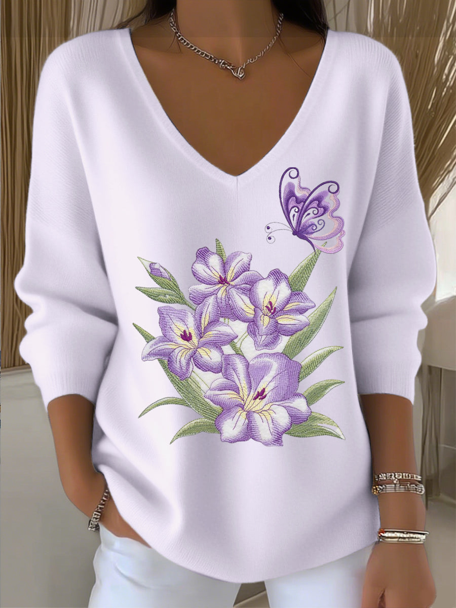 Dámské evropské styl světlé fialové v-neck svetr zdobený roztomilou květinovou výšivkou elegantní a pohodlné představující styl v každodenním oblečení