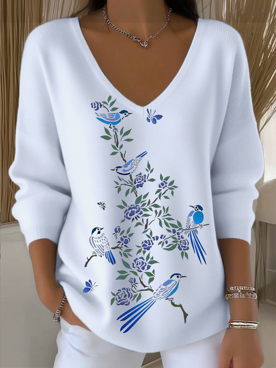 Dámské evropské styl světle modrý svetr v krku s roztomilou vtáčí a květinovou výšivkou elegantní a příjemné vhodné pro každodenní nošení