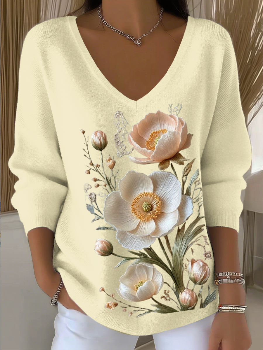 Dámské evropské styl světle žlutý v-neck svetr s nádhernou květinovou výšivkou módní a pohodlné vhodné pro každodenní nošení