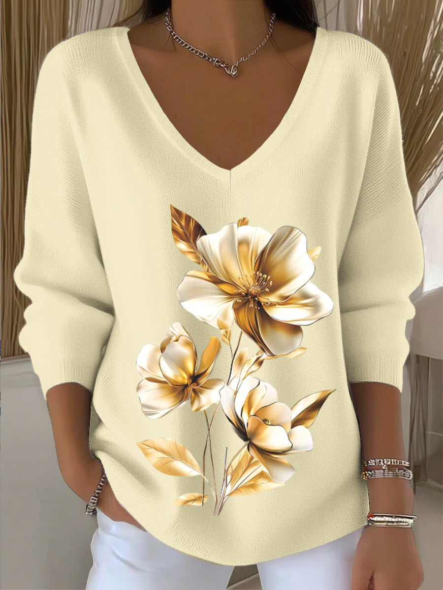 Dámské evropské styl světle žlutý v-neck svetr s okouzlující květinovou výšivkou čistý a volný vytváří rafinovaný každodenní pocit