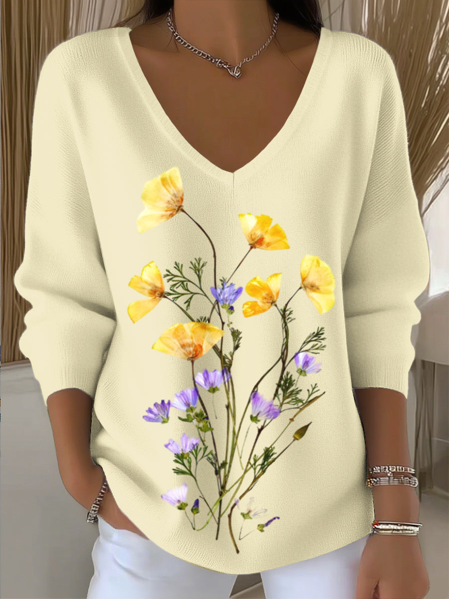Dámské evropské styl světle žlutý v-neck svetr s úžasnou květinovou výšivkou čisté a snadné nosit vhodné pro různé denní styly
