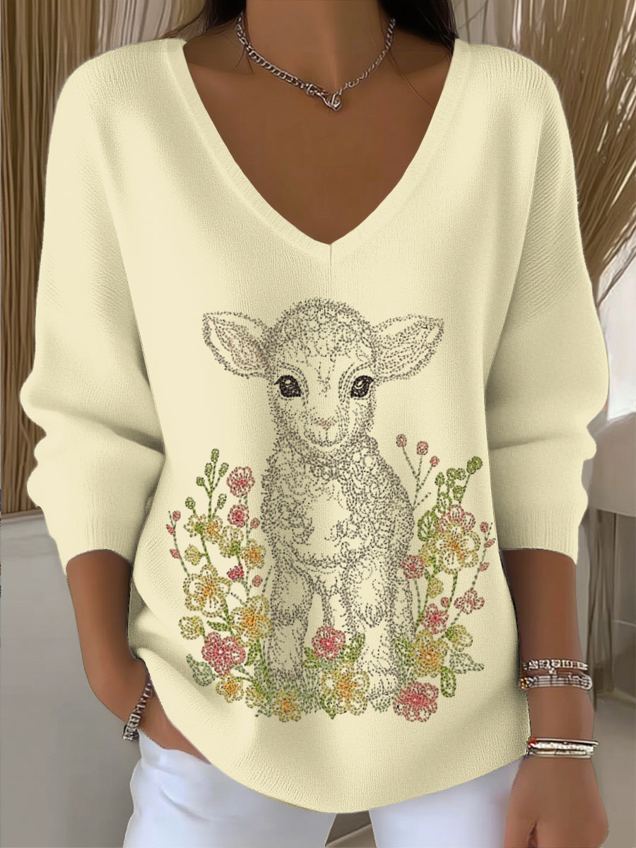 Dámské evropské styl světle žlutý v-neck svetr zdobený roztomilým jehněčím a květinovou výšivkou jednoduchý a módní představující styl v každodenním oblečení