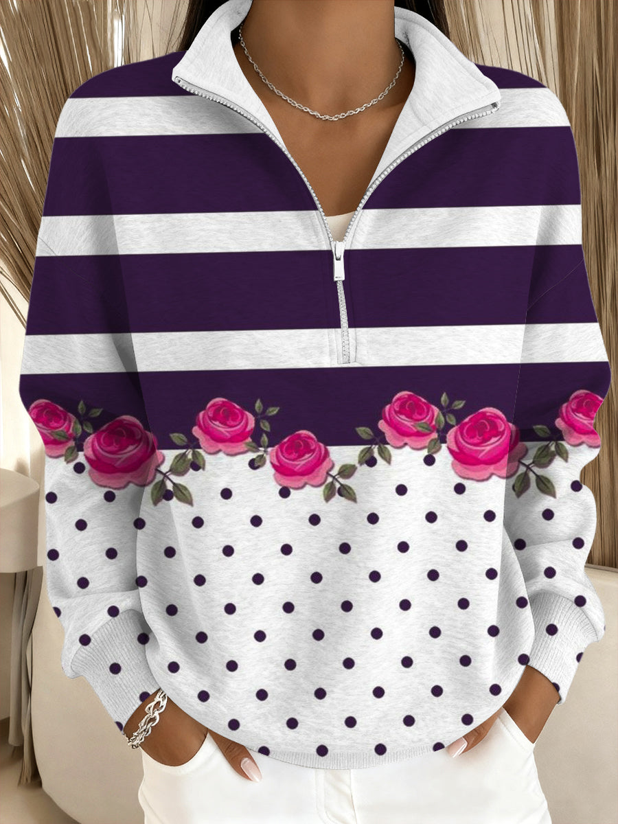 Dámské fialové pruhované růže a polka dot tričko s obojkem