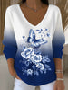 Dámské gradient blue floral & butterfly vneck svetr