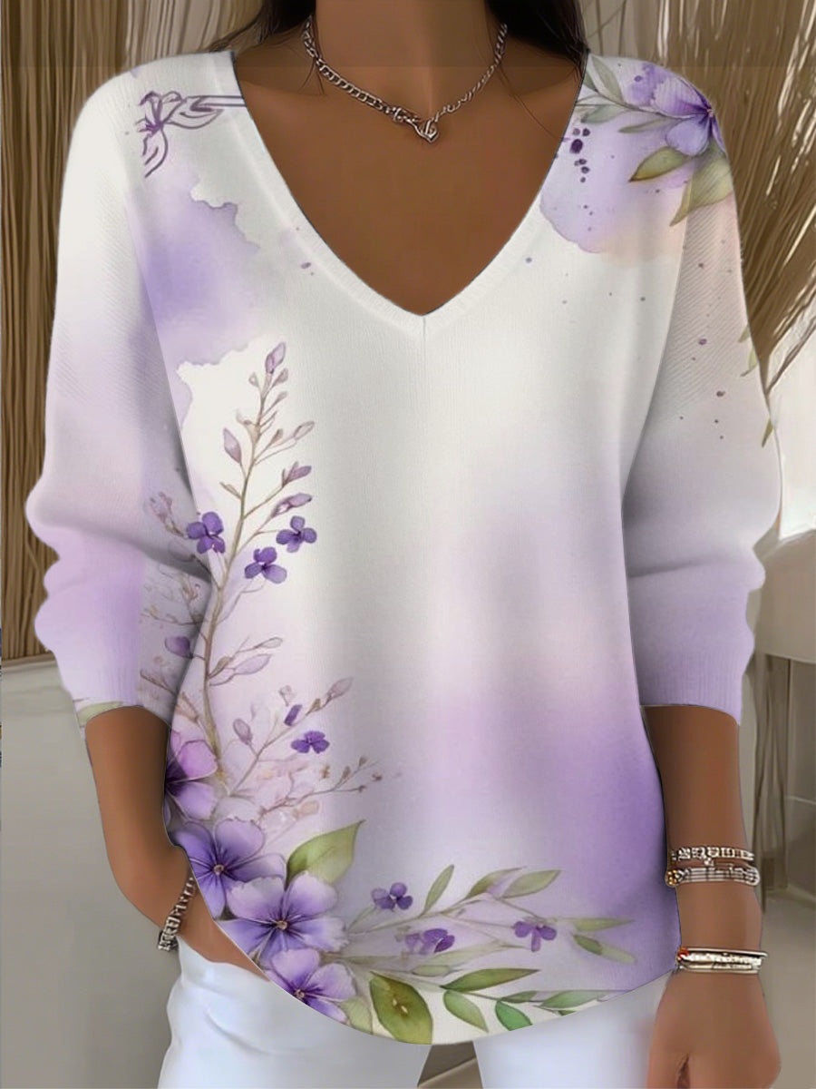 Dámské jemné fialové květinové vneck svetr