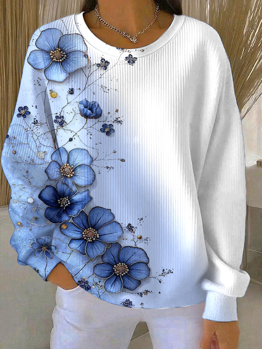 Dámské jemné modré květinové tisk gradient sweatshirt