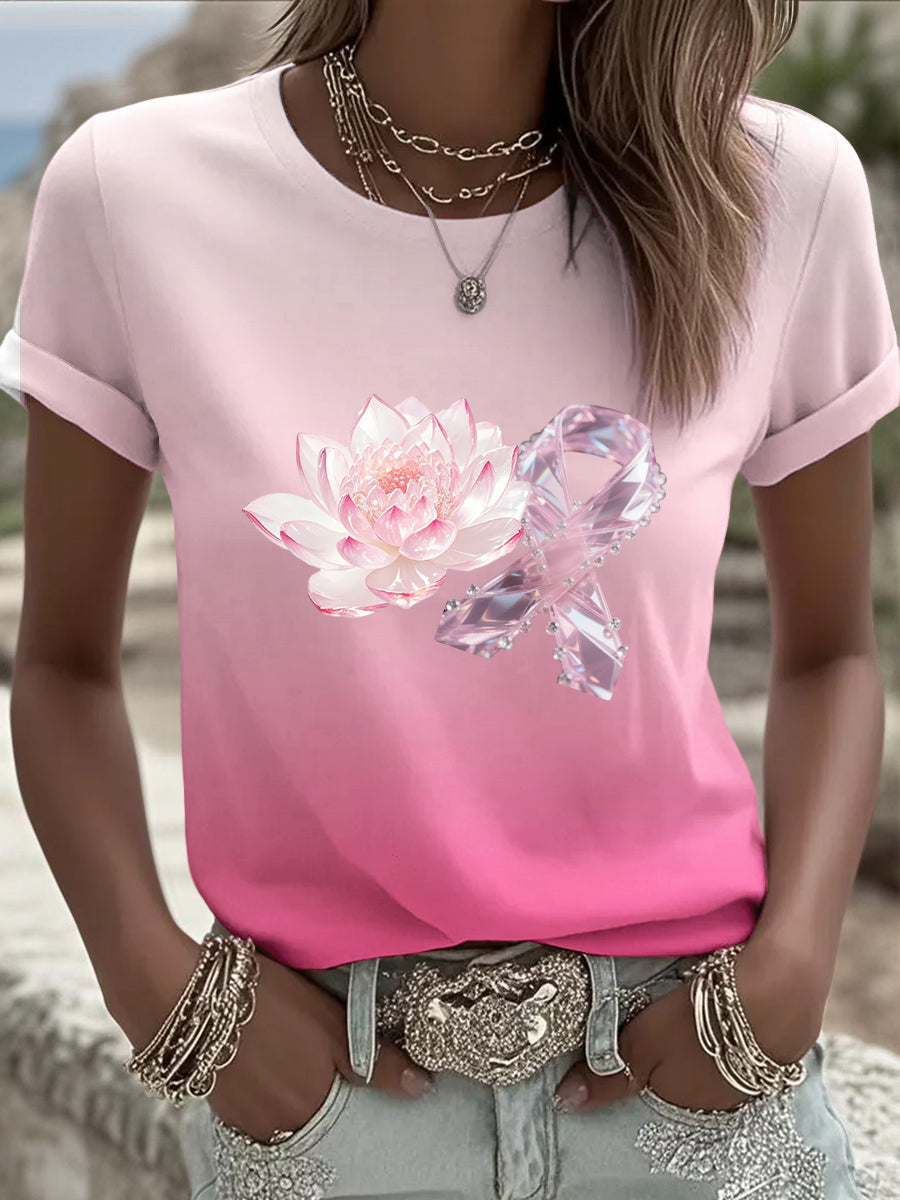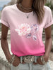Dámské křišťálové růže a stuha tisk gradient růžové casual kolo krku krátké rukávy