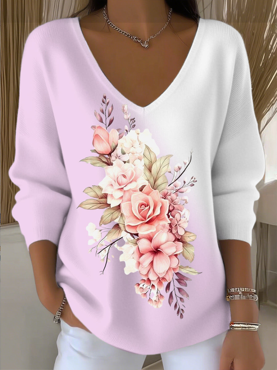 Dámské měkké růžovébílé barvyblok vkrk svetr s romantickou růžovou květinovou kyticí