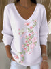 Dámské minimalistický styl světlé růžové květinové a motýlí výšivky v-krku svetr