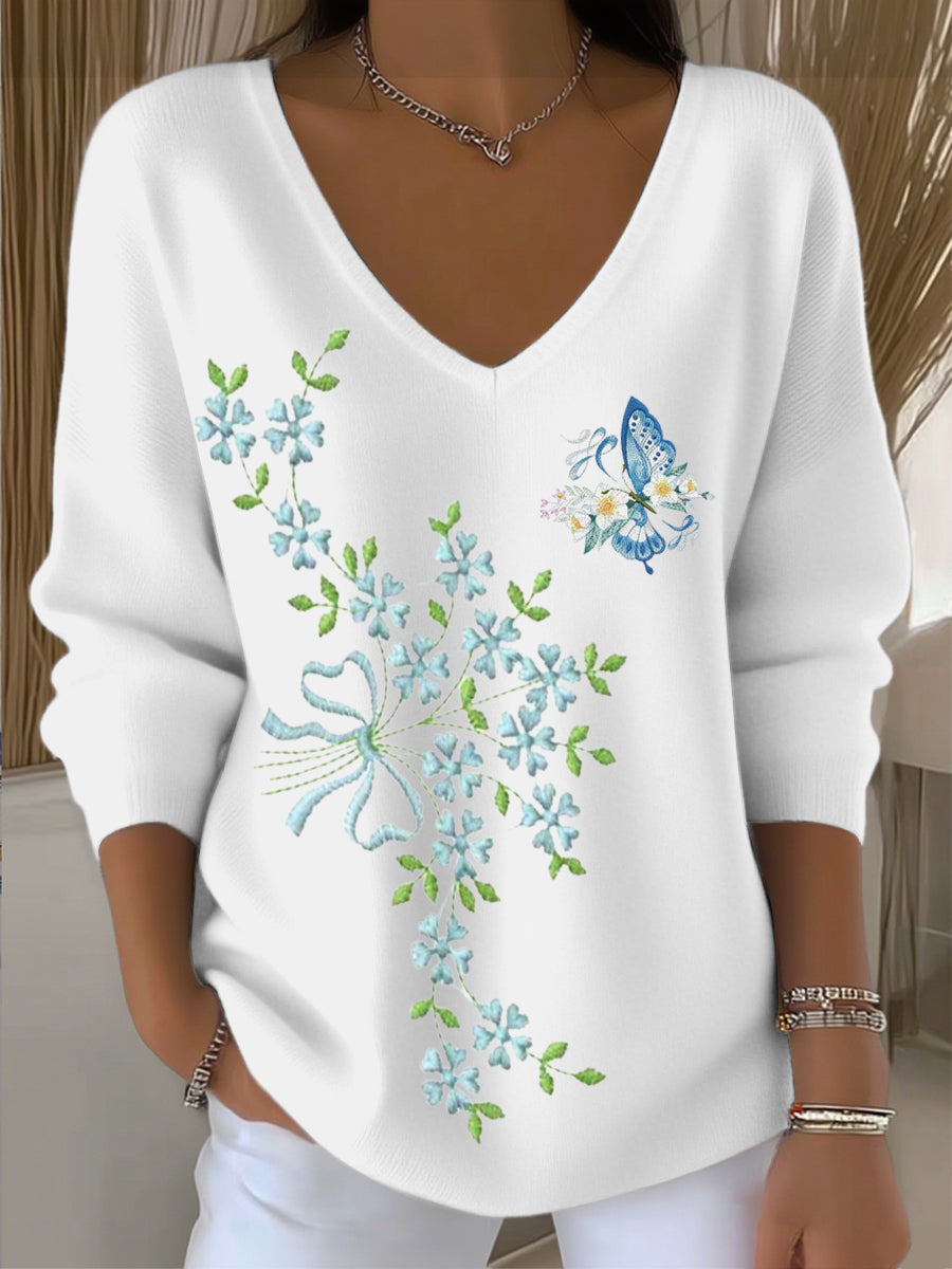 Dámské modré květiny a motýl vyšívané v krku svetr