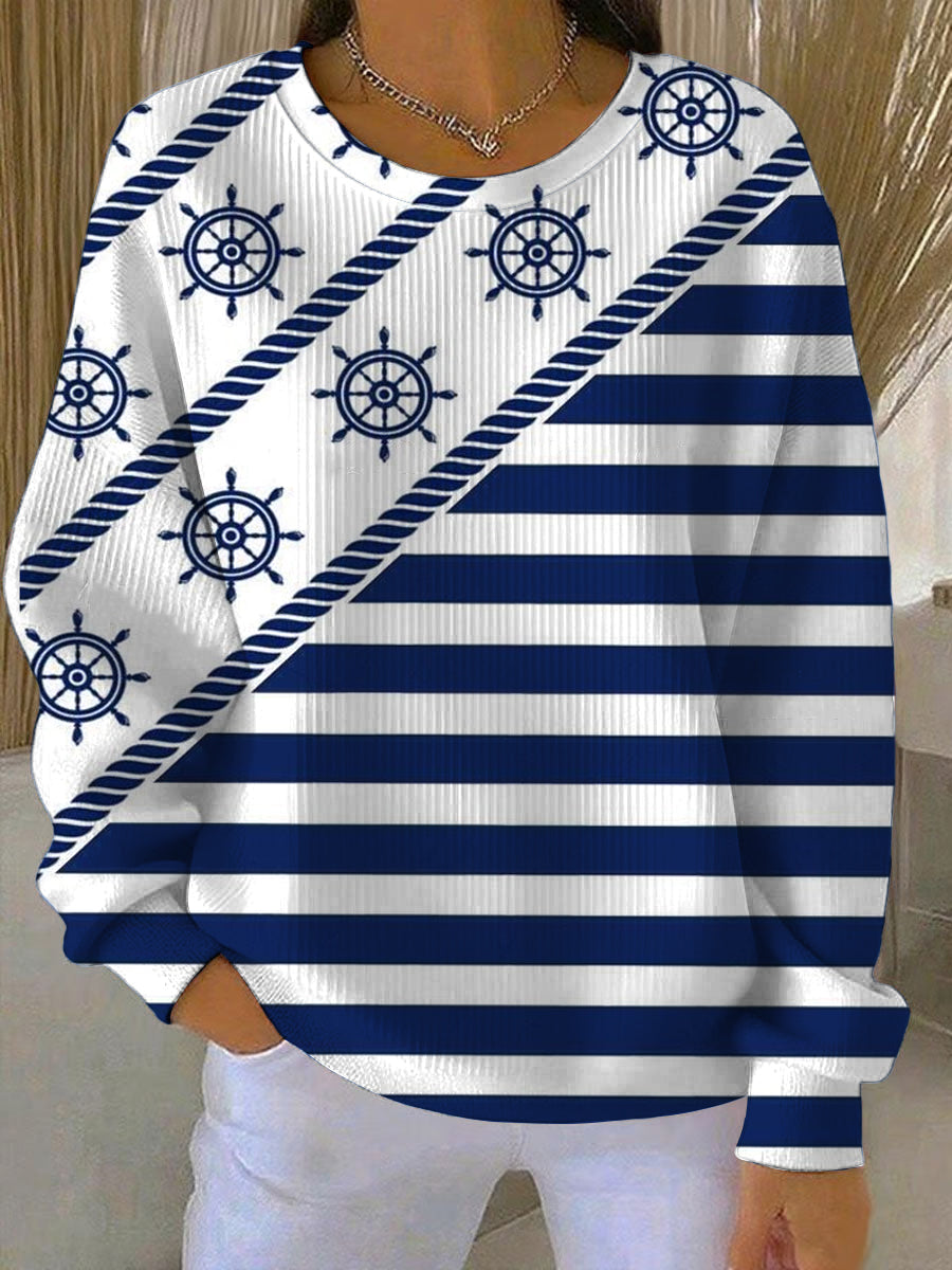 Dámské námořní styl bílá a modrá pruhovaná mikina s modelem lodních kol