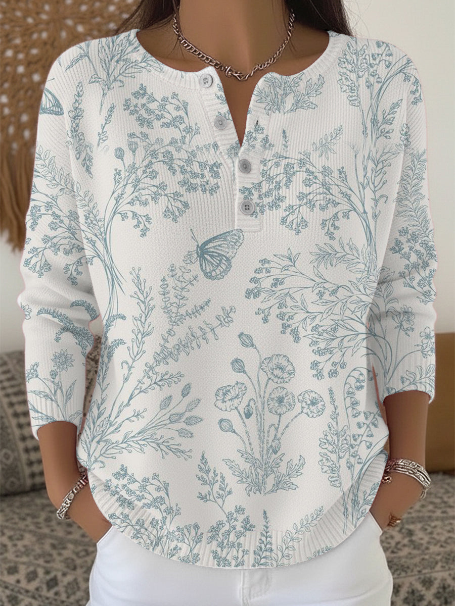 Dámské okouzlující modrý květinový motýl henley svetr