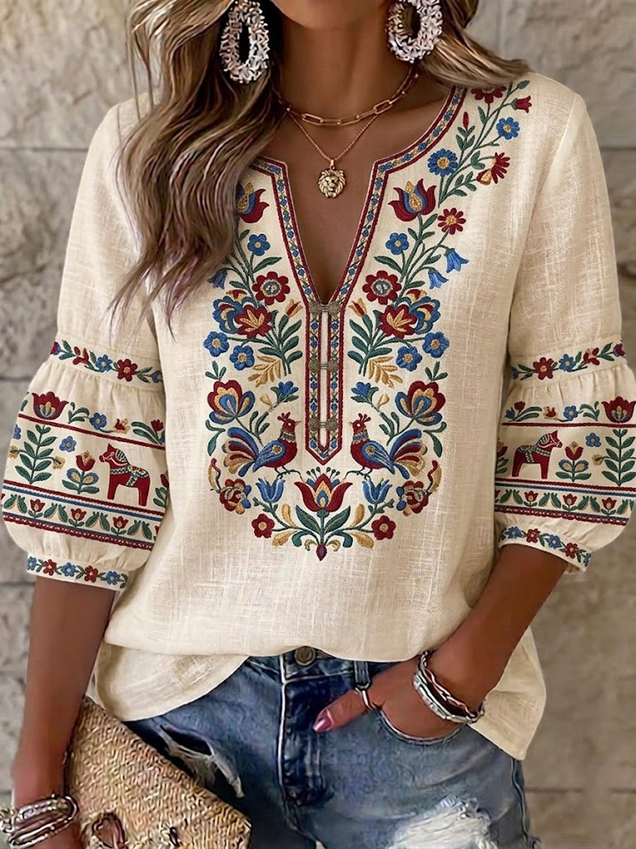 Dámské retro švédské midsummer folk květinové bavlněnélinné blúzky
