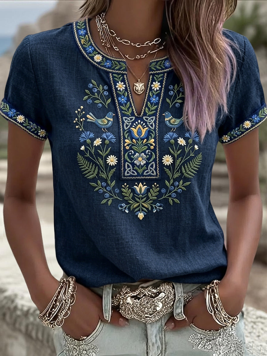 Dámské retro umění švédské letní etnické květinové tshirt v krku