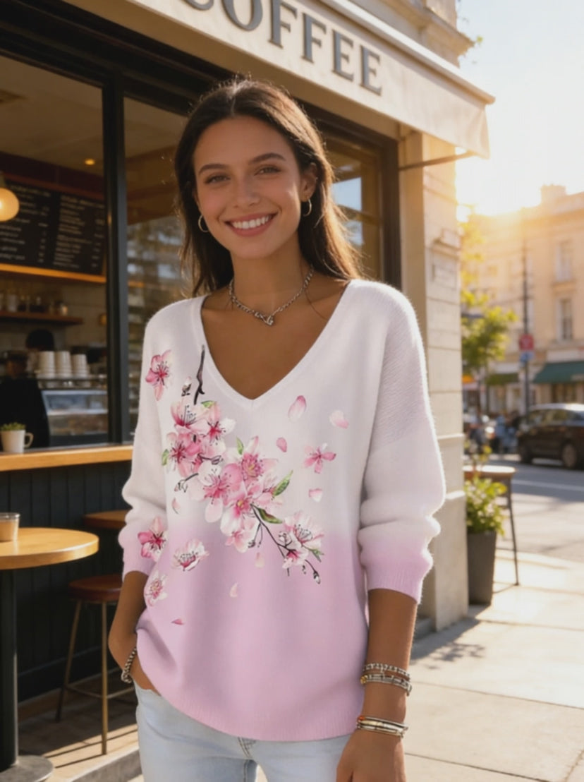 Dámské romantické růžovébílé gradient vneck svetr s růžovým třešňovým květem větev tisk