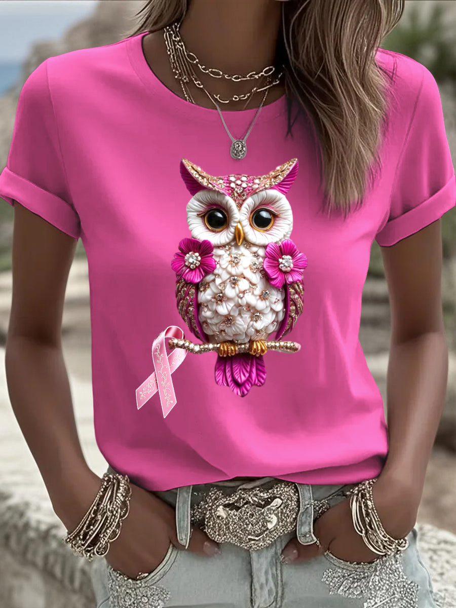 Dámské roztomilé sova a stuha tištěné růžová červená neformální kolo krku s krátkými rukávy
