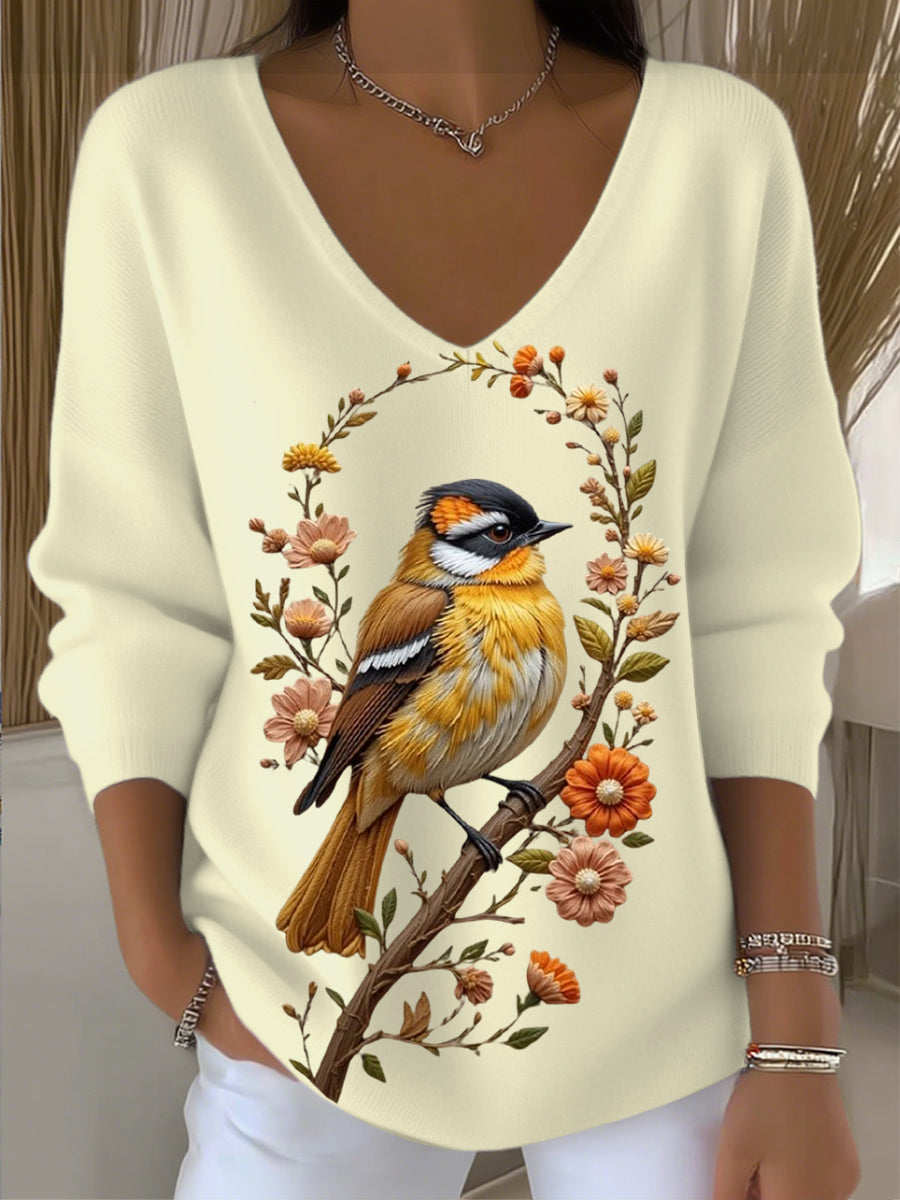 Dámské roztomilé vtáčí vyšívané světle žluté v krku svetr