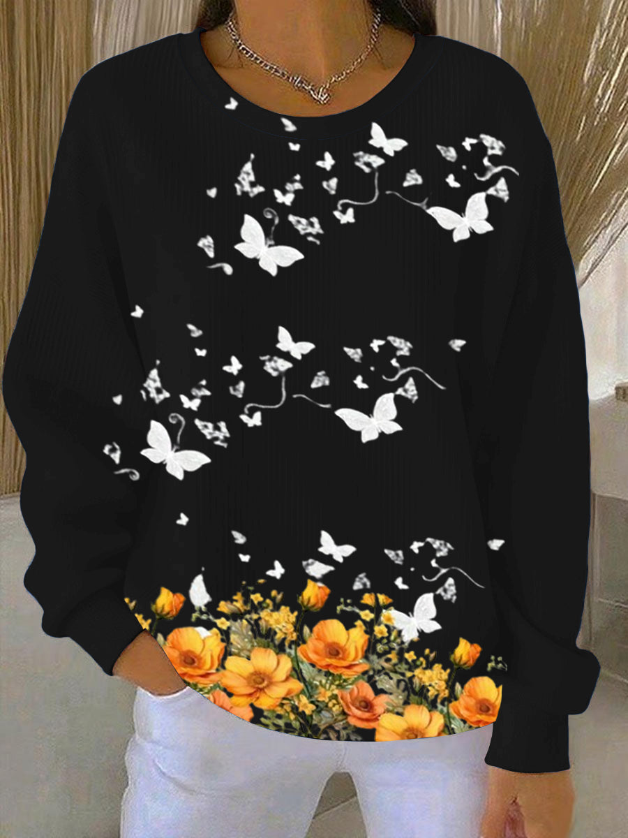 Dámské stylové černé mikiny s bílým motýlem a žlutým květinovým tištěm