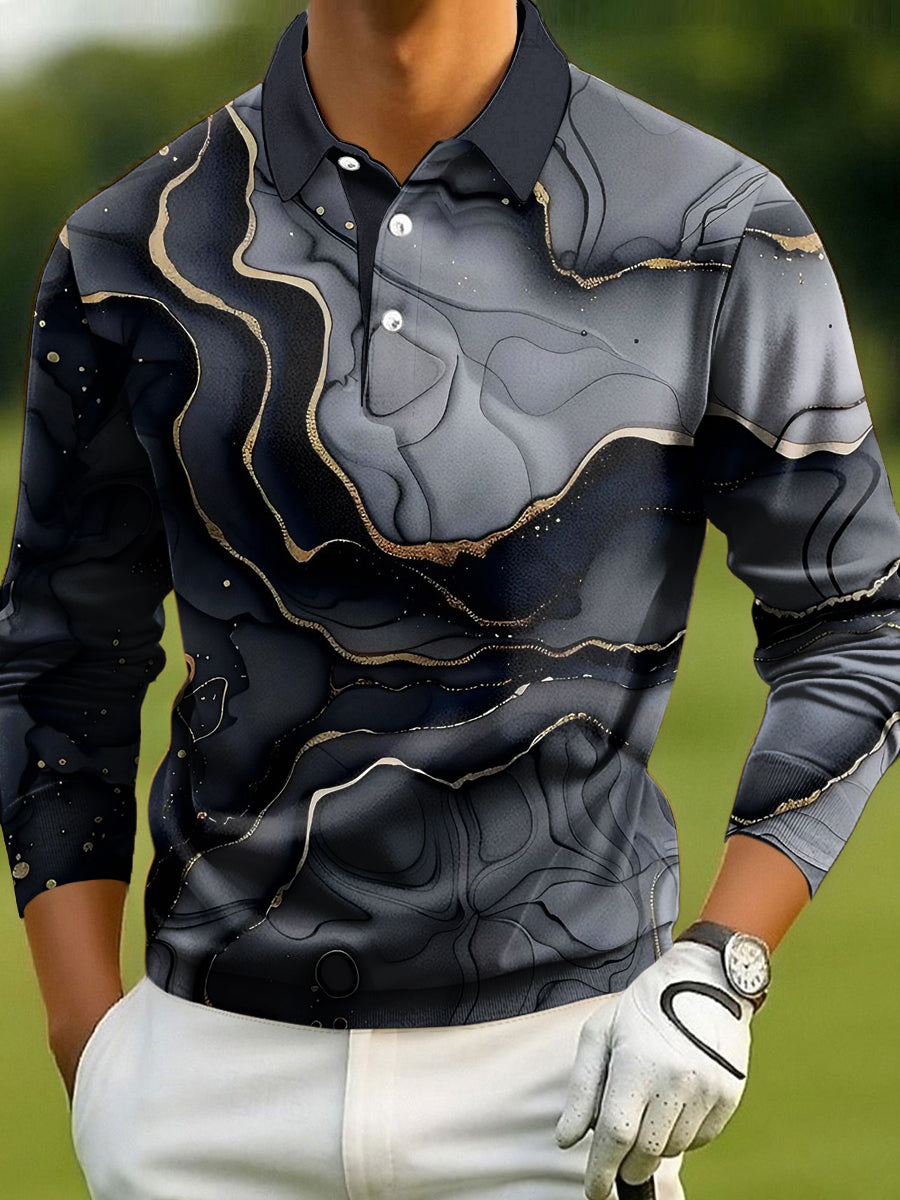 Pánské vintage zlatě pruhované texturované polo s dlouhým rukávem