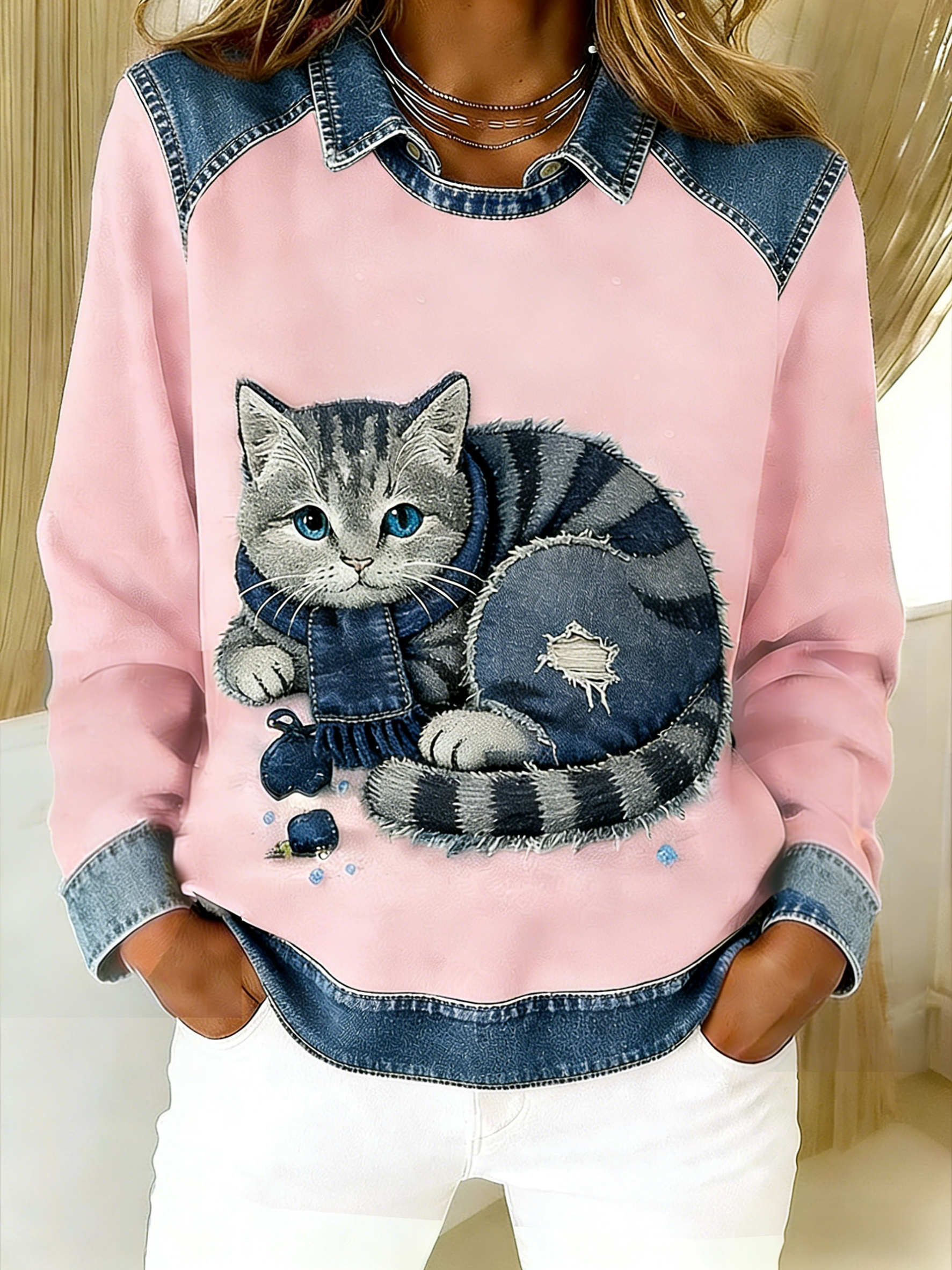 Retro roztomilá kočka džínsová šála patchwork vytištěné neformální volné dlouhé rukávy klopa mikina