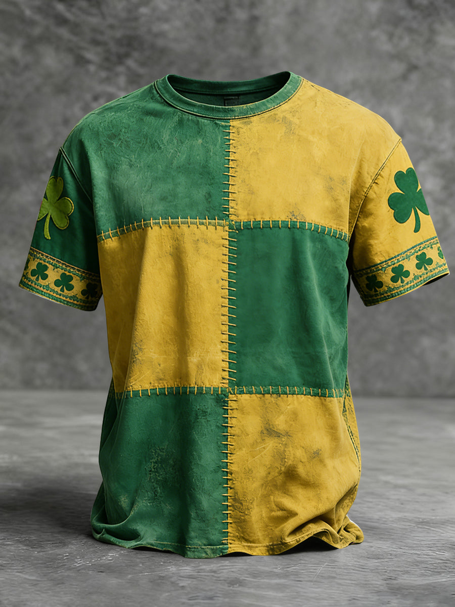 Retro st patricks day shamrock plaid patchwork casual tshirt【potiskový model🍀】