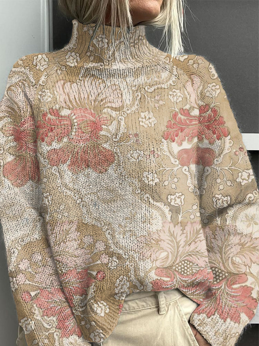 Ženské etnické květinové světlo béžové polokovné pletené jumper