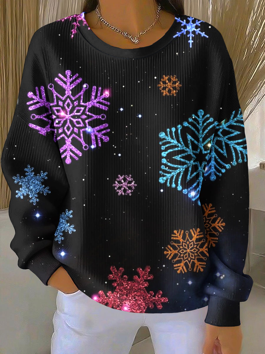 Ženské retro pohodlné pulóver s kruhovou ramenicí a motivem vánočních sněhových vloček