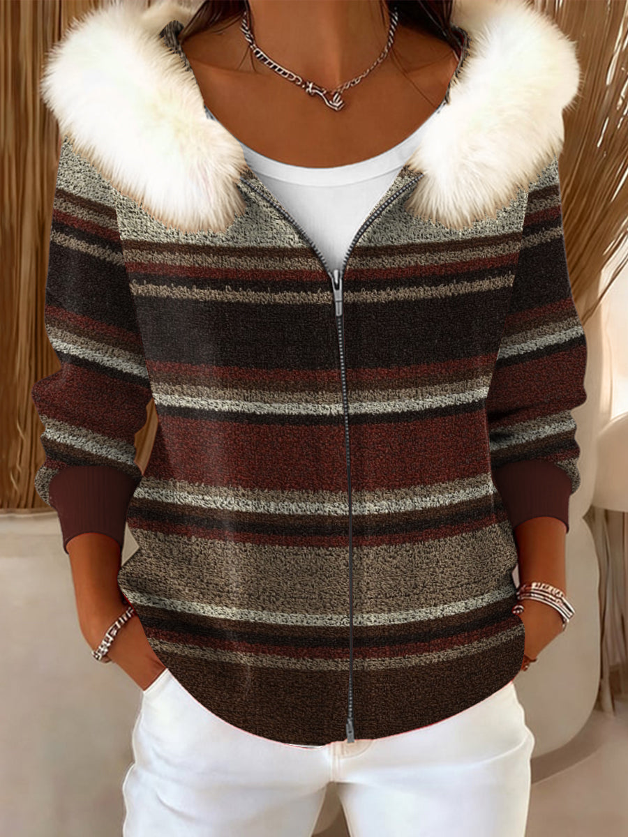 Ženské vintage pruhované umělecké umělé kožešiny obojek s kapucinou kabát