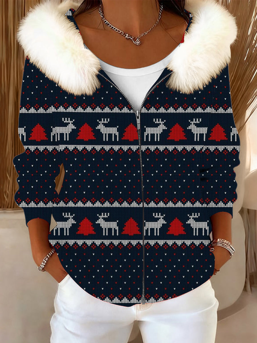 Ženy vánoční slavnostní soby a strom tisk kožešinový obojek bunda
